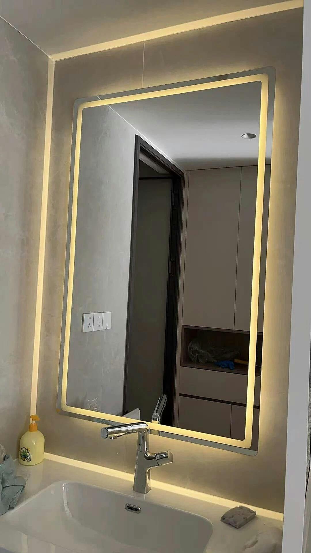 This rectangular mirror with integrated LED lights can be placed anywhere in your home while also offering all the features of a sink-mounted design. The frameless design allows for horizontal or vertical installation and includes a touch sensor to change colors to match your mood. Furthermore, the dimmable lights enhance the personalized experience. Built-in LED lights. This essential home piece will undoubtedly add a modern touch to your living space. How to adjust the lights?