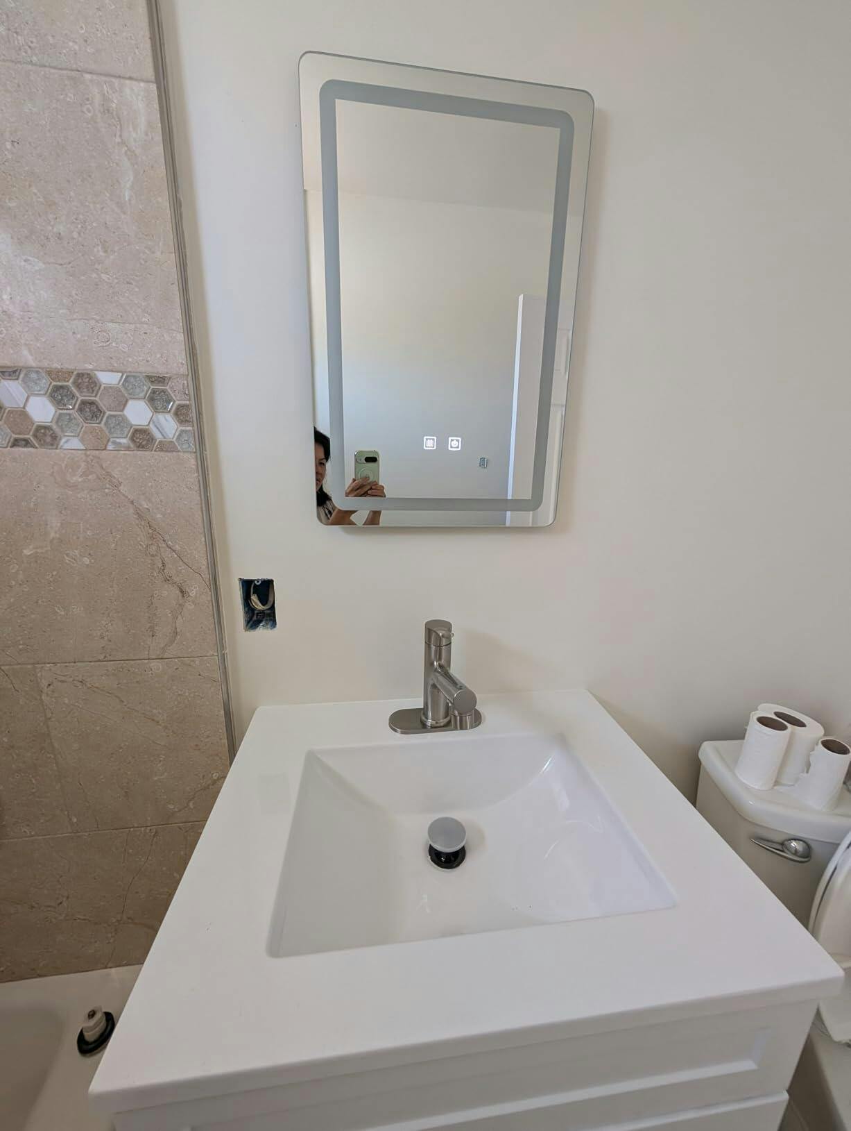 This rectangular mirror with integrated LED lights can be placed anywhere in your home while also offering all the features of a sink-mounted design. The frameless design allows for horizontal or vertical installation and includes a touch sensor to change colors to match your mood. Furthermore, the dimmable lights enhance the personalized experience. Built-in LED lights. This essential home piece will undoubtedly add a modern touch to your living space. How to adjust the lights?